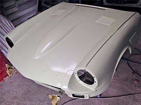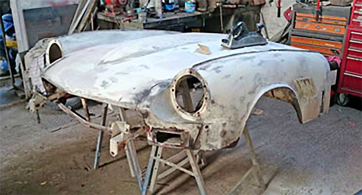Another area which suffers from corrosion is the clamshell front bonnet assembly. Mine was shot in 1980, so I bought a brand new Stanpart spare which had suffered a little damage (in fact 3 had been been put on top of each other!). Nowadays new bonnets are still available from BMH for the GT6 Mk3 and Spitfire Mk4/1500 and also T.D.Fitchett. T.D. Fitchett are also advertising new bonnets for the GT6 Mk2. All are around £1,500. Repair panels are also available, for example front wings for the later GT6/Spitfire are available from BHM/Steelcraft. Fibreglass bonnets are also available, for example SC Parts sell one for the GT6 Mk2 less tubes etc. for around £700. My bonnet can be seen below, both before and after its second restoration!