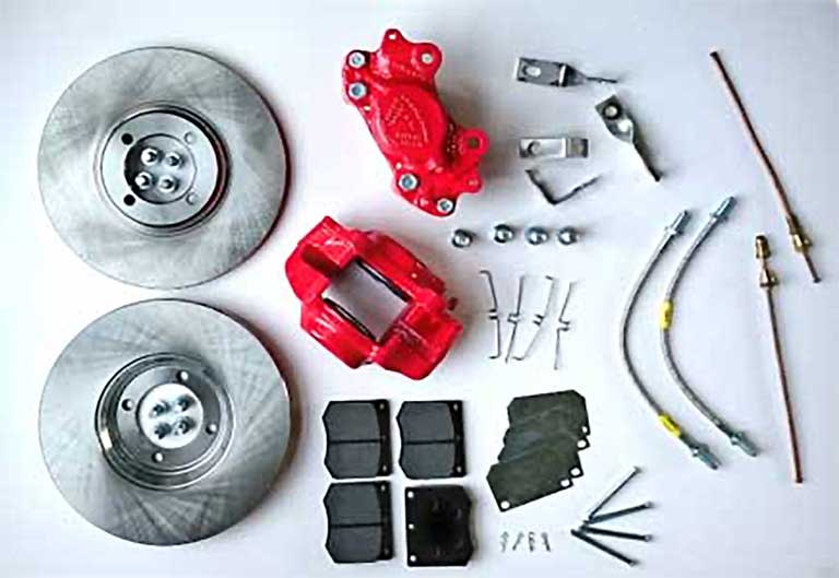 New “performance” Mintex M1144 disc brake pads were fitted (see above). The holes had to be drilled out to 1/4″ to take the larger pad pins. These pads have a friction coefficient of just over 0.4 and are designed to work well from cold. Compared to standard brake pads they offer increased fade resistance and better brake modulation. They are also larger than standard, offering a greater contact area. All the front brake components can be seen below, prior to fitting. Apart from the refurbished calipers they include new disks, pads, shims, pins,stainless steel brackets, bolts, Earl aviation quality flexible braided stainless steel and copper brake pipes.