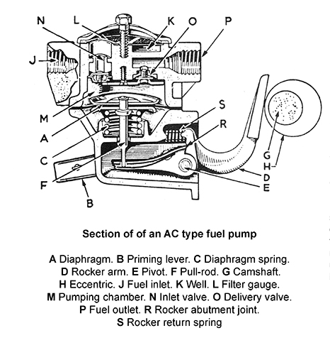 One of the most common type of fuel pumps used in automobiles was the single action, diaphragm-type mechanical pump (before the advent of modern electronic fuel injection). A diaphragm type fuel pump is usually mounted on the engine and is operated by an eccentric lobe on the camshaft. The GT6 is fitted with 2 different types of fuel pump, originally made by AC, the division of General Motors originally founded by Albert Champion of spark plug fame (see above). The GT6 Mk1 was fitted with the version with a glass sediment bowl, as were many Fords of the 50s and 60s, as per the first picture below. This didn’t contain a filter (fitting a separate filter is recommended) but at least one could see if there was any sediment! Later models of GT6 were fitted with the brass top version, as per the second picture below.