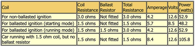 A table showing the values for non-ballast resisted and ballast resisted ignitions is shown below. The nominal voltage given by a 12v battery is 12.6v which gives 52.9 watts power to the ignition with non-ballast resisted ignition (1st row). When ballast resisted ignition is in starting mode (i.e. the ballast resistor is bypassed, 2nd row) a power of 48.2 watts to the ignition is given, even when the voltage drops to 8.5v as can happen when a large proportion of current goes to the starter motor, as when the engine is cold. After the car has started (3rd row) the ballast resistor kicks in to increase the total resistance to 3 ohms, which gives 52.9 watts power to the ignition. With a 1.5 ohm coil but without the ballast resistor (4th row), the power would be double, around 105 watts, which would burn out the ignition, hence the need for a 1.5 ohm ballast resistor with a 1.5 ohm coil! Incidentally later cars didn’t have the ballast resistor as shown above, instead they had a 1.5 ohm wire which had the same effect.