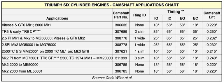 There are a variety of camshafts fitted to the Triumph Six Cylinder Engines, usually identified by their (Stanpart) Part Number.