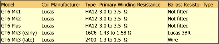 It is critical, therefore, that a 1.5 ohm coil is fitted with a ballast resisted ignition and a 3 ohm coil to a non ballast resisted ignition! Generally the various GT6 models were as the table below (as per the official workshop manual):
