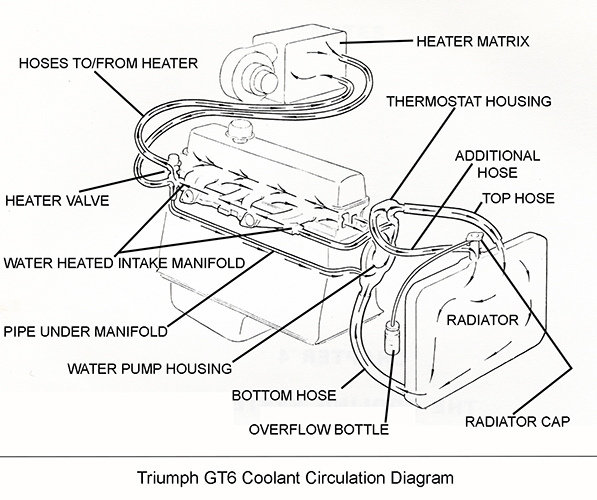 Looking at the diagram above (from Triumph’s official Workshop Manual) there are five rubber hoses. The largest are the top and bottom radiator hoses and there is an additional hose from the thermostat housing to the radiator (below the filler) to prevent air locks when filling. The other two hoses run to and from the heater matrix (situated under the dashboard) from the heater valve. A small pipe runs from the radiator cap to an overflow bottle which is attached at the side of the radiator. When the thermostat is closed the water flows from the water pump housing into the water passages in the cylinder head through which it goes into the engine block. Water also flows through the heated inlet manifold. It returns to the water pump through other passages in the cylinder head. When the heater valve is open it circulates through the heater matrix and returns through an additional pipe located under the manifold. When the thermostat opens the water also circulates through the radiator, in at the top hose and out through the bottom hose. A useful description of cooling systems per se can be seen on the CarParts.com website by clicking here.