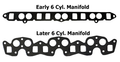 Triumph made various types of cylinder head. They can be identified by two numbers, one actually cast into the cast iron head, and the other stamped (like an engine number). The early Triumph 6 cylinder engines (including the GT6 Mk1) had a completely different cylinder head to later models. It is easily identified by the all the ports being inline, wheras the later “wide” cylinder head did not. This is best illustrated by looking at the manifold gaskets, below: