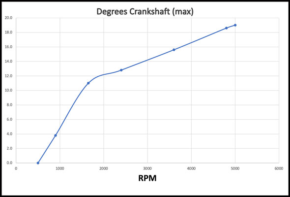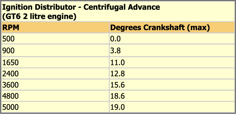 Ignition is “timed” to occur just before the piston in cylinder 1 (nearest the front of the engine). According to Wikipedia “the need for advancing (or retarding) the timing of the spark is because fuel does not completely burn the instant the spark fires, the combustion gases take a period of time to expand and the angular or rotational speed of the engine can lengthen or shorten the time frame in which the burning and expansion should occur. In a vast majority of cases, the angle will be described as a certain angle advanced before top dead center (BTDC)”. Static timing for the Triumph 6 cylinder engines should be 10 degs. BTDC. Dynamic timing (controlled by centrifugal weights within the distributor) should be as the table below (with the curve further below):