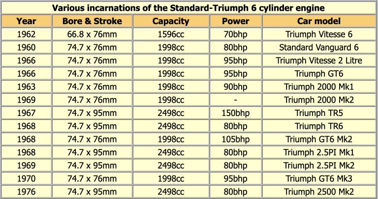Although the 6 cylinder engine was based on the 4 cylinder, David Eley, who was responsible for both, says that it “wasn’t just a six-cylinder version of the SC” and talk of finding the seam where the additional cylinders were added is wrong! It was not even manufactured in the same factory, being cast at Bean Industries (pictured below) which Standard-Triumph had acquired in 1956 (it’s history goes back to the ‘Bean’ motor-car, click here to find out more). According to the Wolverhampton History & Heritage website, Beans produced engine castings for Triumph made from “Bilchrome”, a special cylinder iron developed in-house. However the new engine did share the location of the ports, distributor and camshaft, and had similar front and rear block faces to the 4-cylinder SC version. Below is a cut-away of the 2 litre engine, showing the position of the main components. Also the cylinders were siamesed i.e. cast with no water jacket between each pair, this was done so the engine would be short enough to fit into the Standard Vanguard 6. This also later helped when fitting the unit to small cars like the GT6 and Vitesse. However this also meant that there wasn’t room to increase the capacity by enlarging the bores, the only way to do this was by increasing the stroke (see table below).