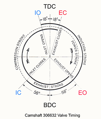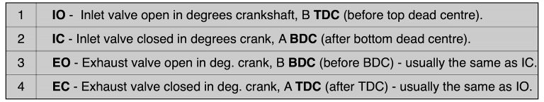 In these cases IO and EC are the same, as are IC and EO (the above would be described as an 18°/58° camshaft). IO/EC and IC/EO only differ in the more ‘extreme’ camshafts, as for example the ISKY road & race camshaft where the IO is 24° and the EC 1 degree more at 25°.