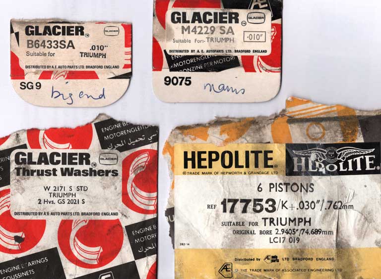 The engine was replaced by a 2.5 litre from a 1972 Triumph 2.5PI (less the petrol injection). This was rebuilt by the owner towards the end of 1980, with the help of the machine shop of R. C. Williams of Bachymbyd Garage, Llanrhaeadr near Ruthin, who rebored the cylinders (+0.030″) and reground the crankshaft (+0.010″). This process would involve reboring in 0.010″ stages, finishing to just under +0.030″ by a few thousands of an inch, and finishing by honing (grinding with stones rather than cutters) to precisely +0.030″.