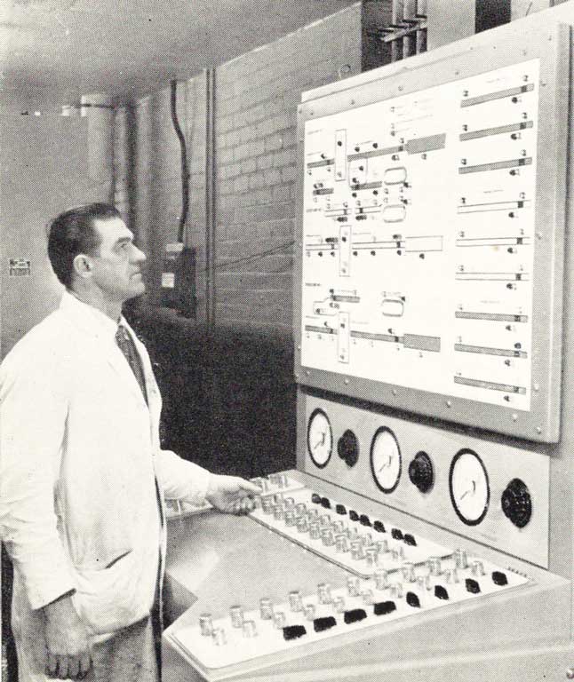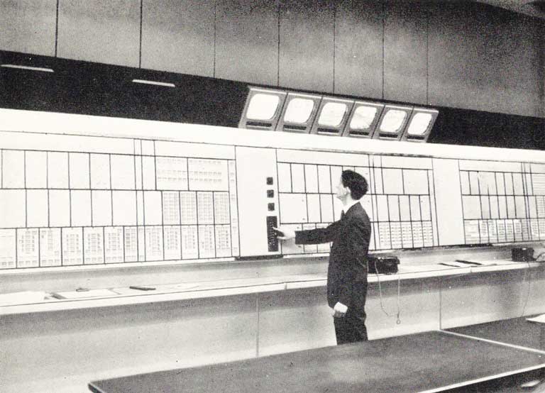 The top picture shows the CCTVs used to monitor the production line. The lower shows the Control Desk. Images are from The Triumph Companion by Kenneth Ullyett.
